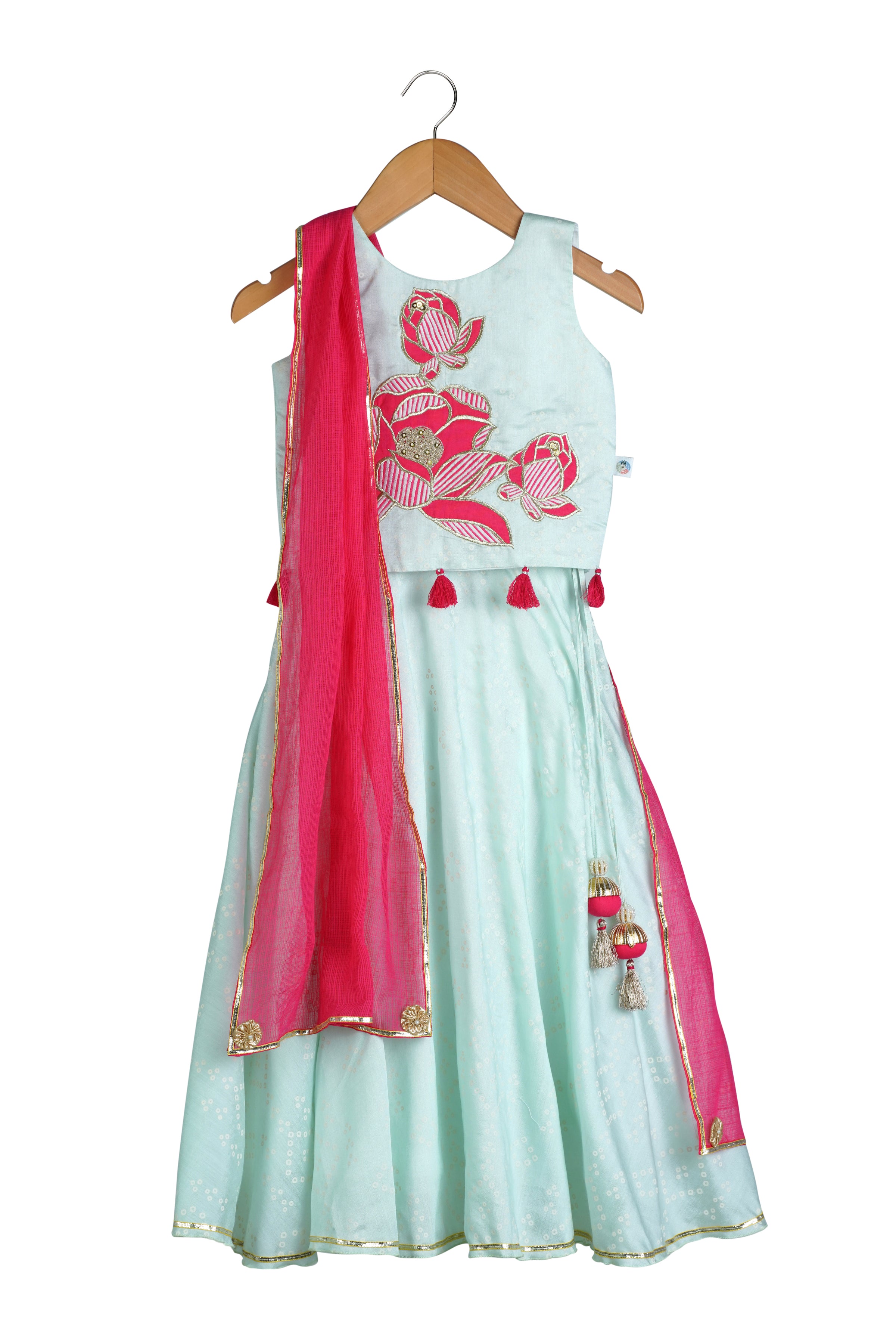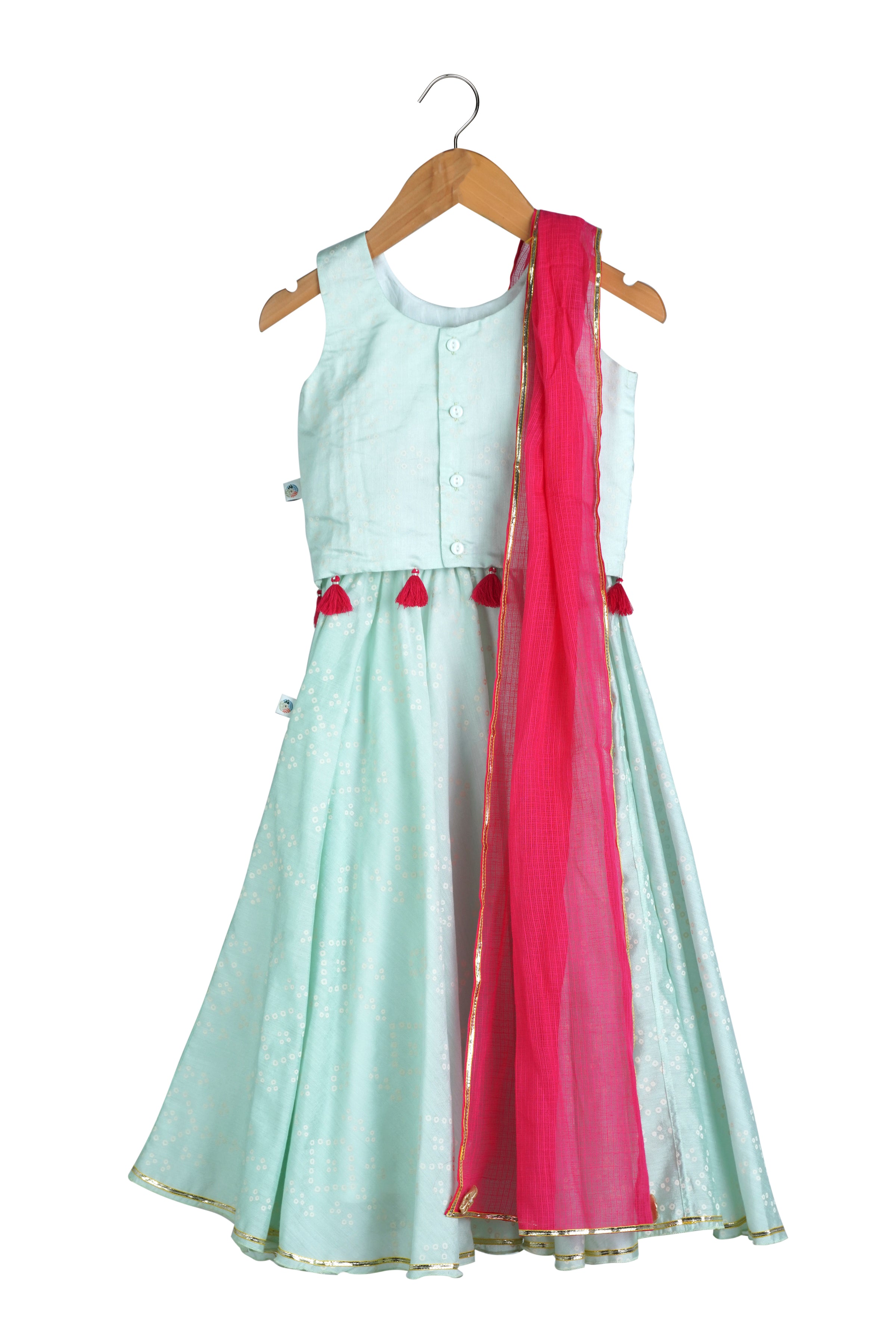 We always strive to produce unique, lovingly handcrafted and practical apparel. And we use only the finest handwoven textiles and GOTS Certified Organic cotton. Our classic bandhej lehenga is beautifully embroidered with contrast floral motifs. This is further accentuated with tassels and delicate sequins and pearls. The contrast dupatta completes the look. Strikingly beautiful and stylish. Most importantly, there is "no chubhi chubhi". The entire ensemble is buttery soft and perfect for children's delicate skin.