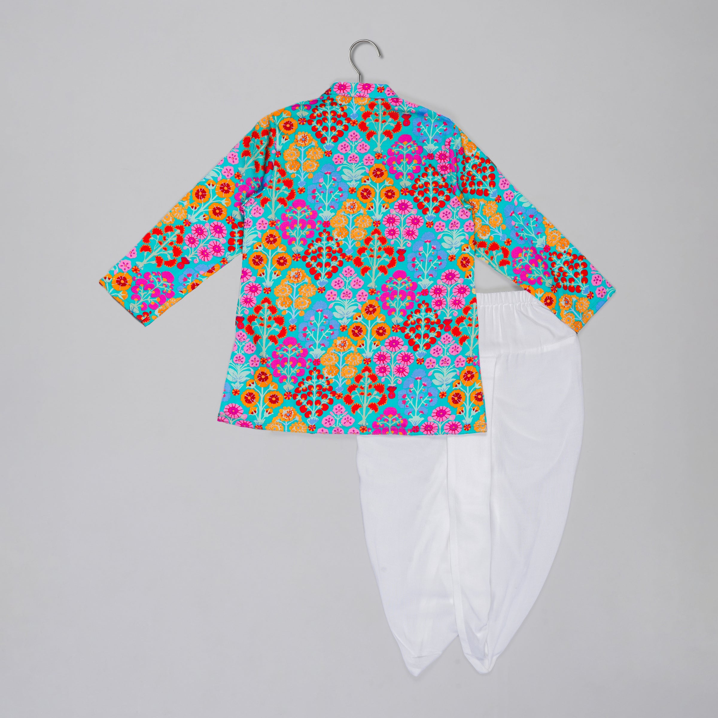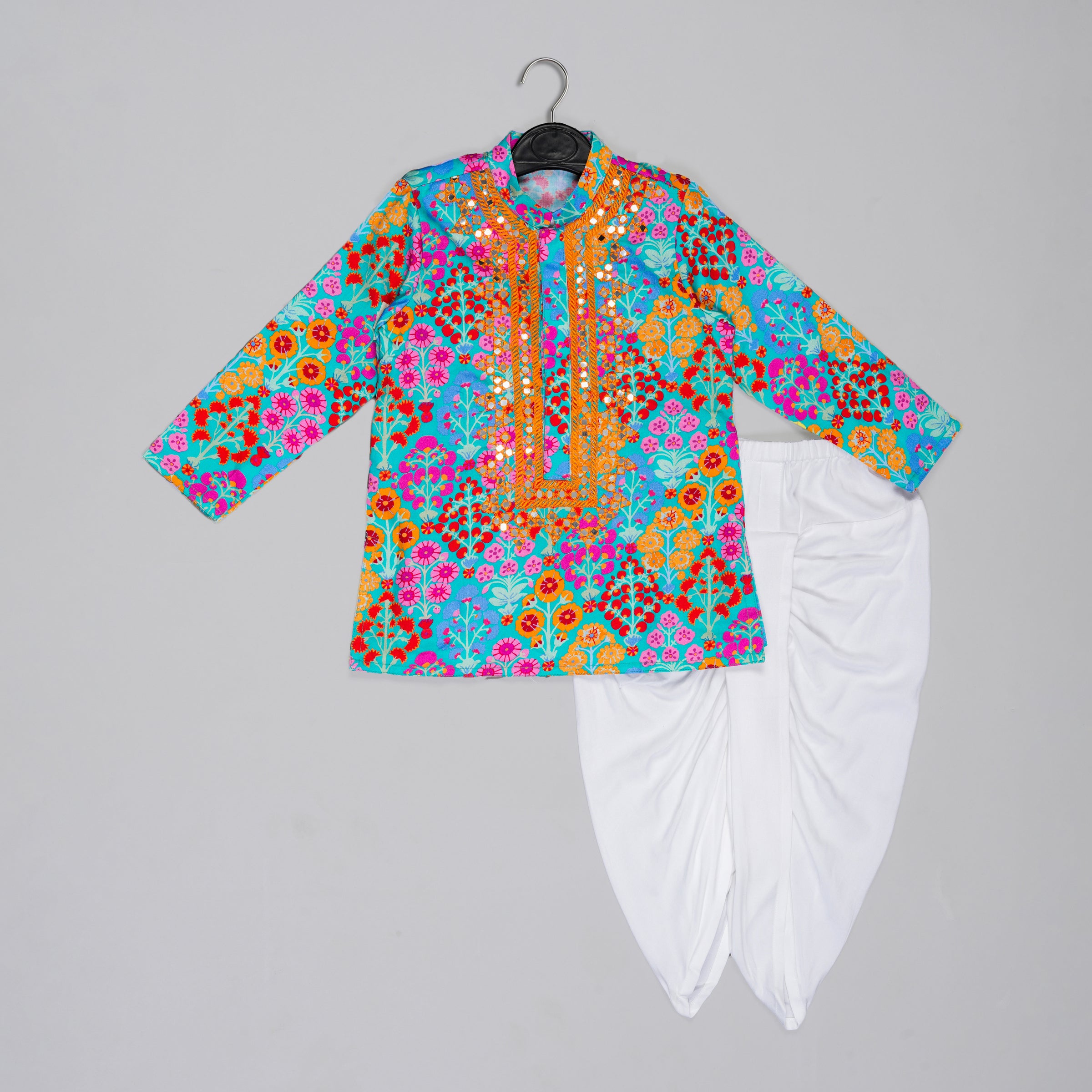 BLUE FLORAL PRINTED MIRROR WORK AND EMBROIDERD KURTA WITH DHOTI SET