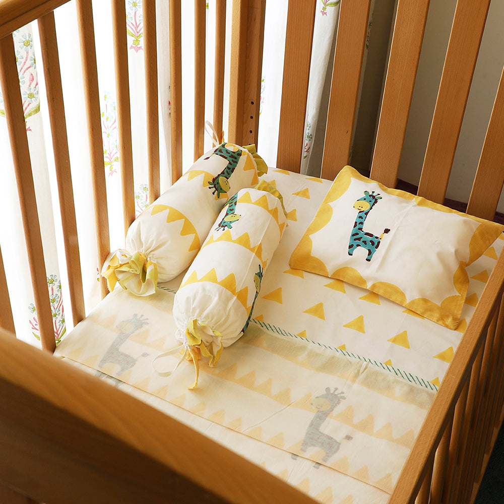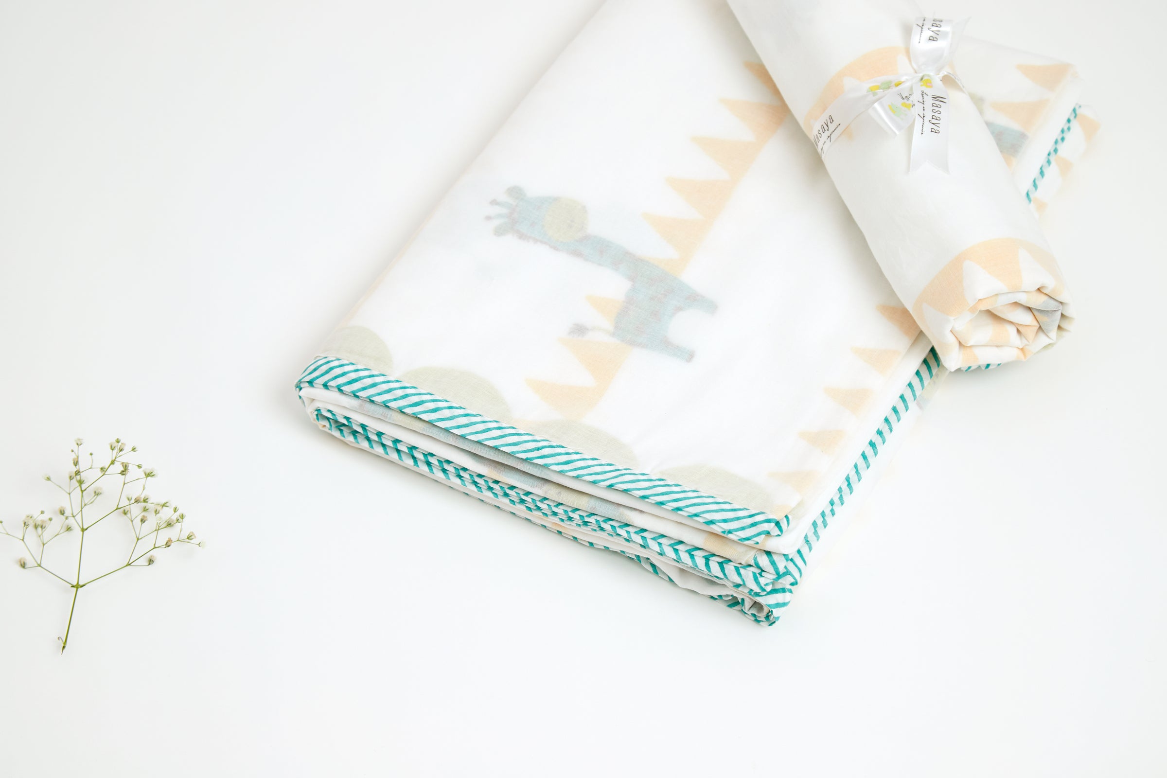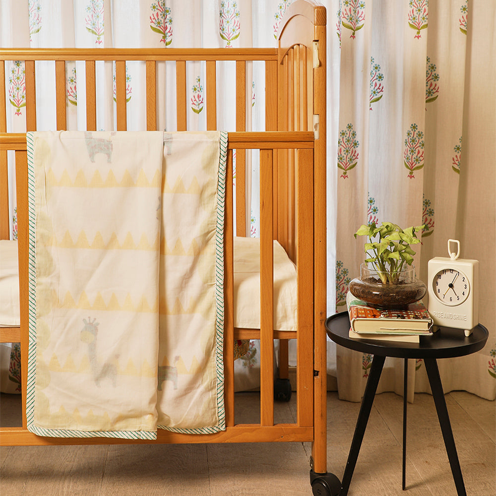Tuck in your little one into the world of comfort. After all, he has had a long day of play with the giraffe. Our 3 layer muslin blanket is perfect to snuggle in all day long, and its geometric print makes it versatile and easy to carry on the go.
