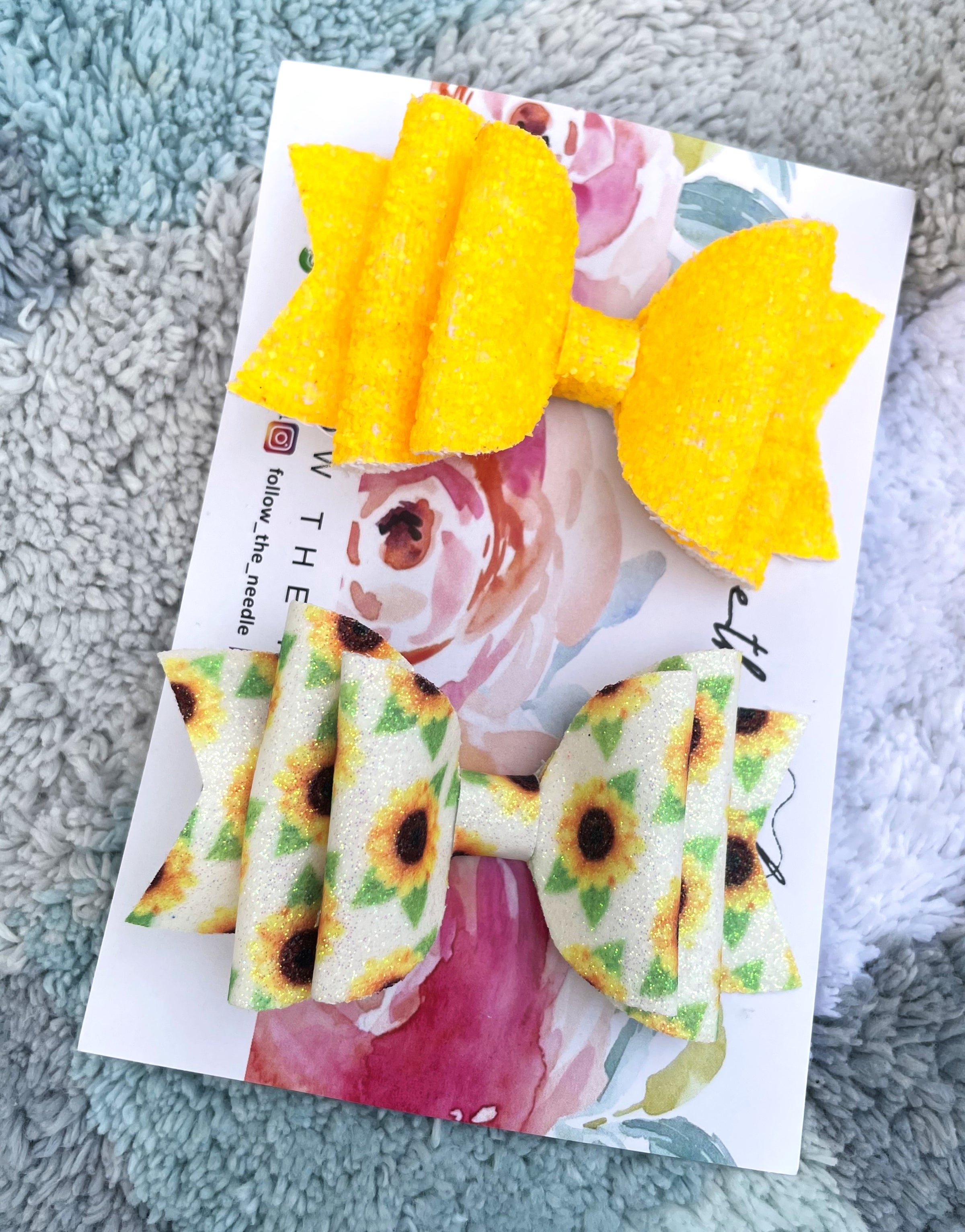 Description: Faux Leather Sunflower Glitter Bows Set of 2