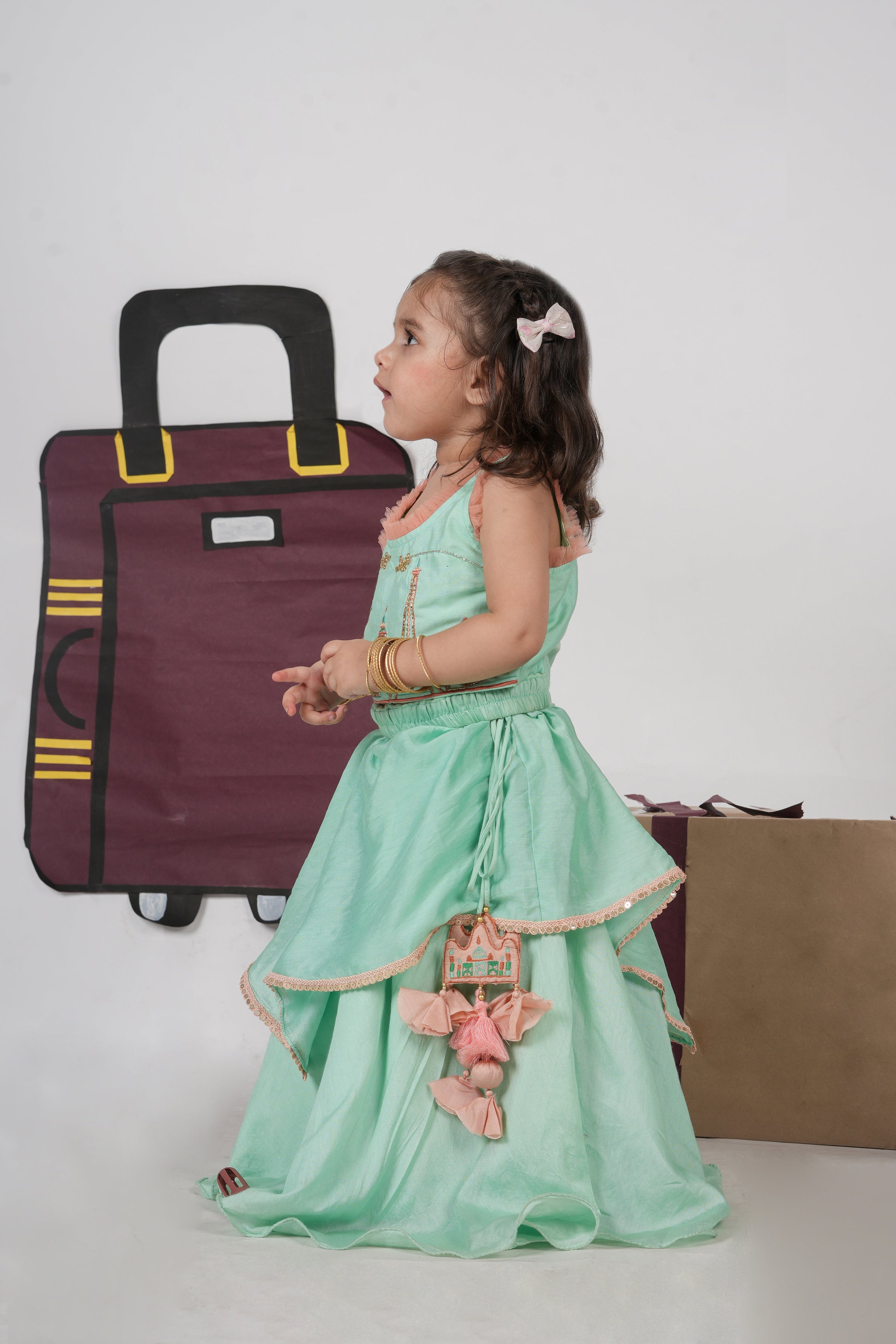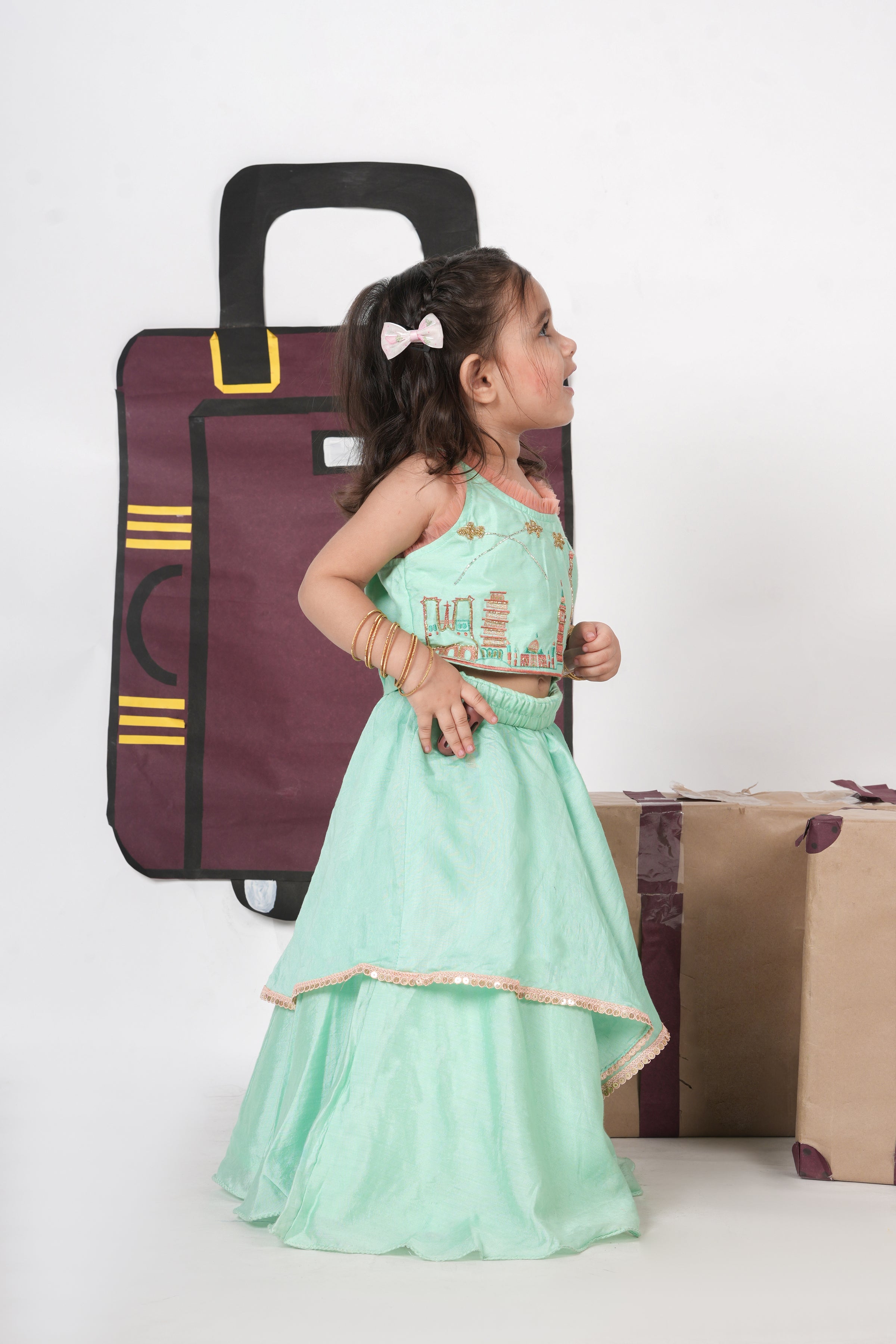 MINT GREEN TRAVEL THEME HAND EMBROIDERED BLOUSE WITH DOUBLE LAYER GHAGARA SET
