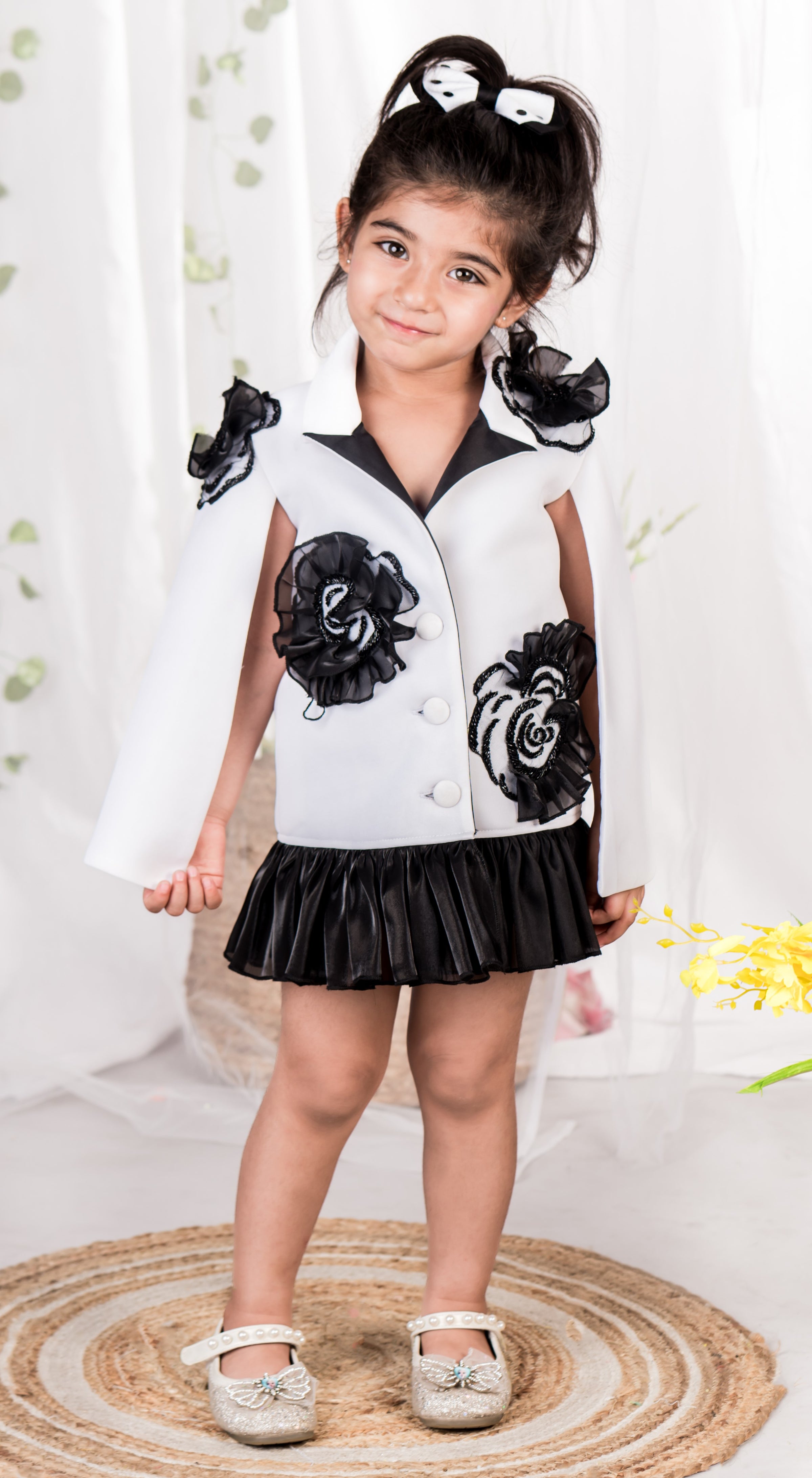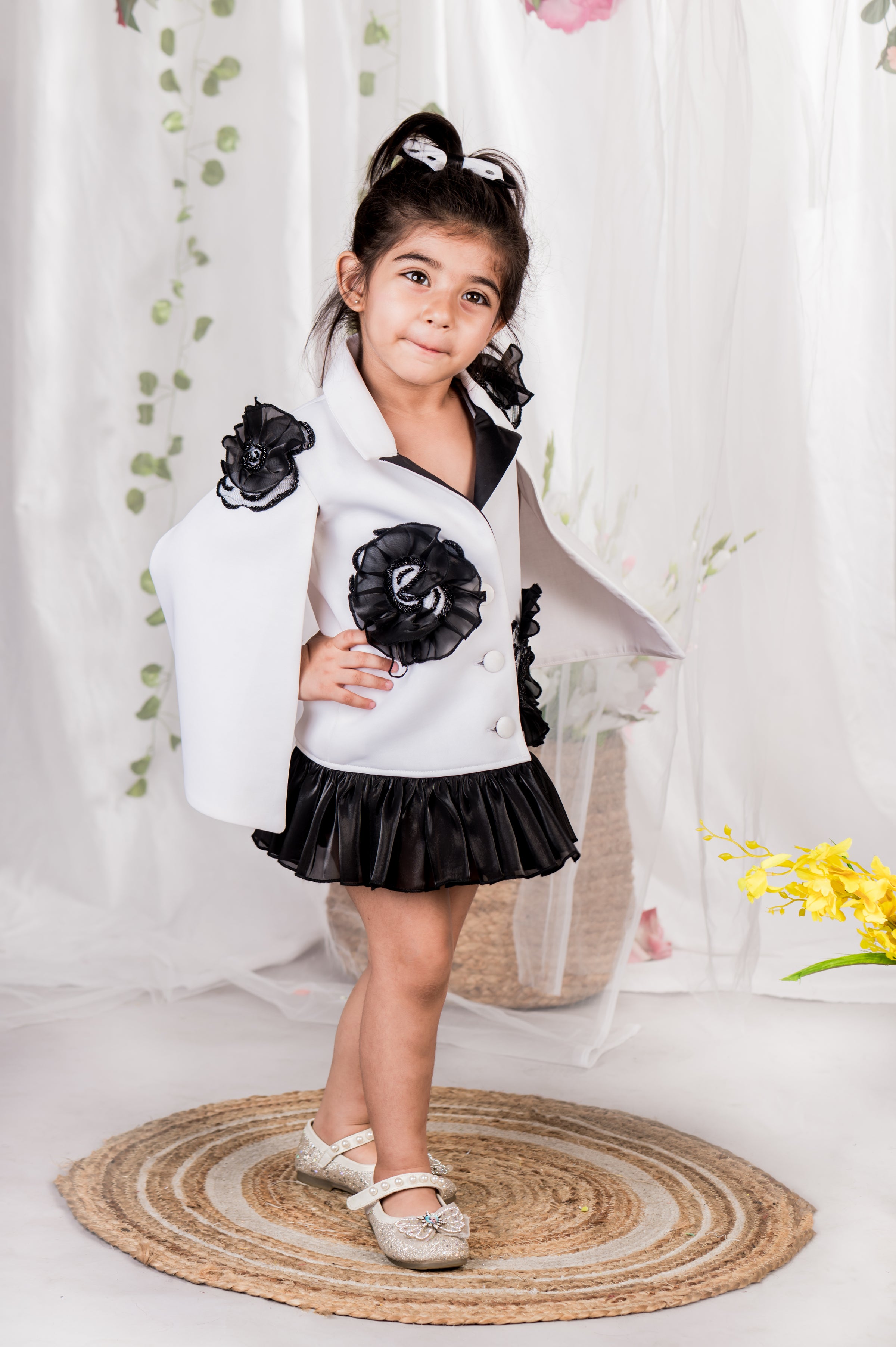 Introducing our captivating White Neoprene Blazer Dress. The standout feature of this dress is its striking cape sleeves, adding a touch of drama and flair to the ensemble. Accentuating the neckline is a remarkable black satin lapel, adding a hint of contrast and sophistication. But the true showstopper of this dress is the 3D hand-embroidered rose flower embellishment adorning the front. Each rose is meticulously crafted with cutdana and organza, creating a stunning visual effect that adds a touch of romance and femininity to the dress.
