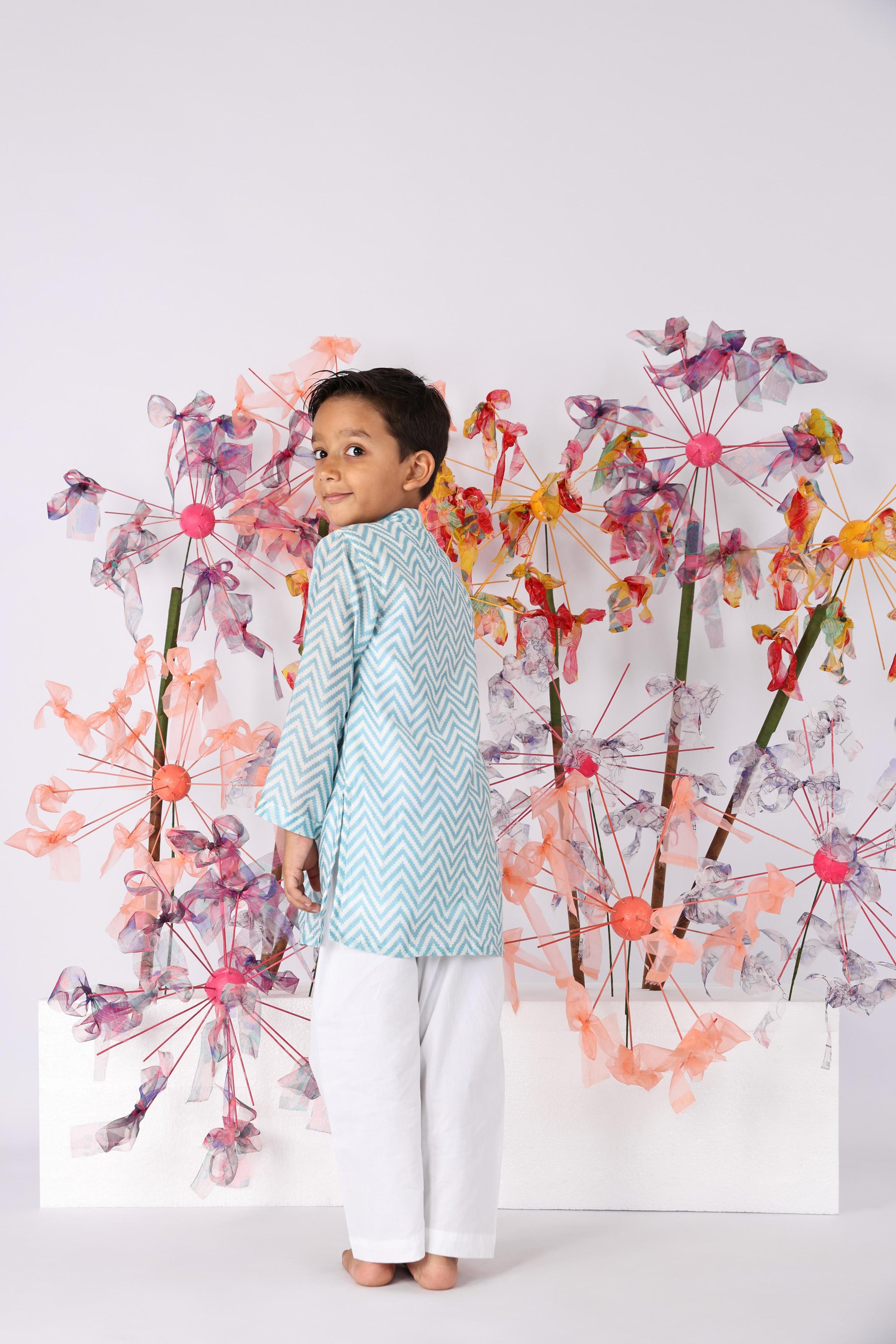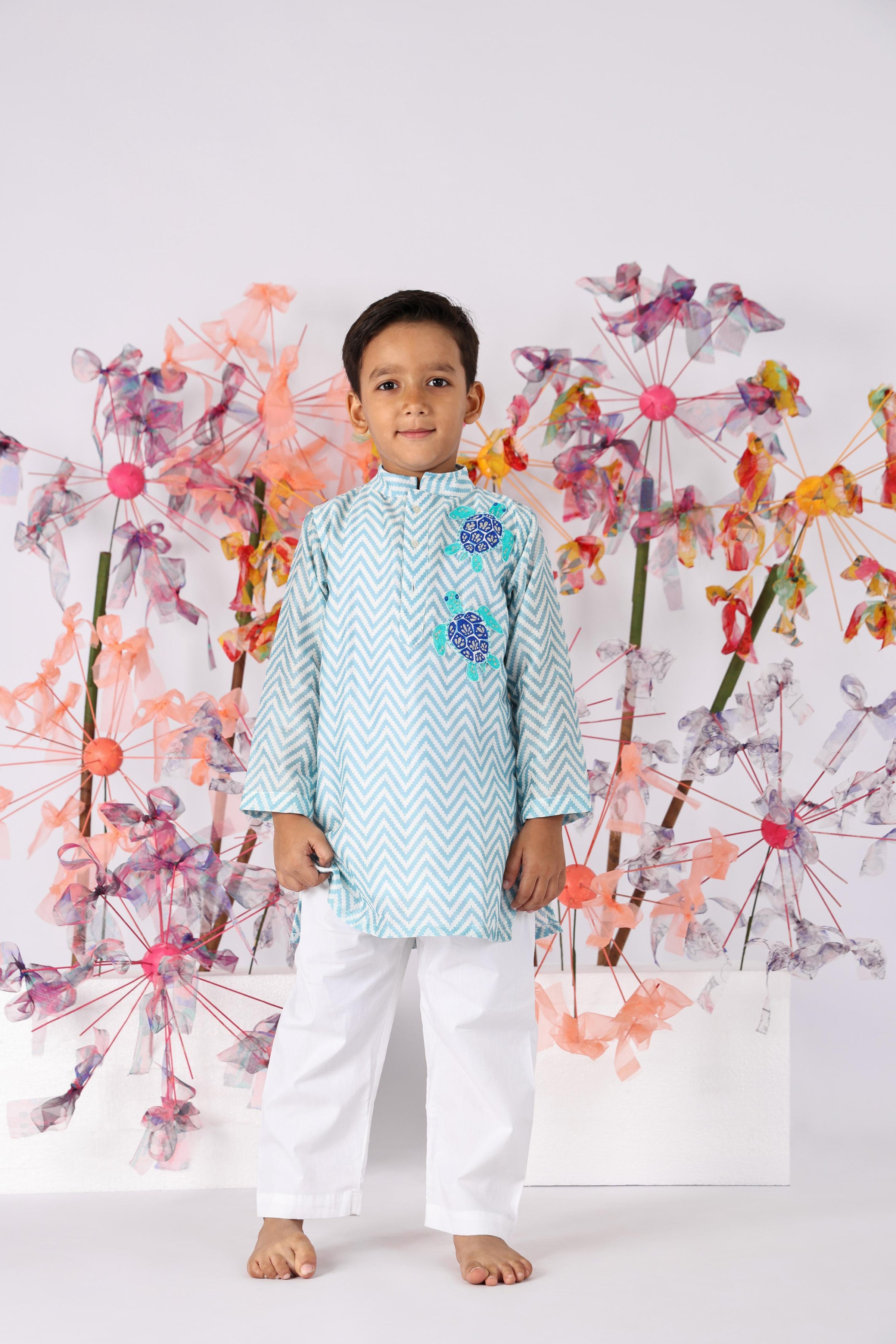 Blue Chanderi Chevron Print Kurta with Embroidered Turtle and White Pyjama