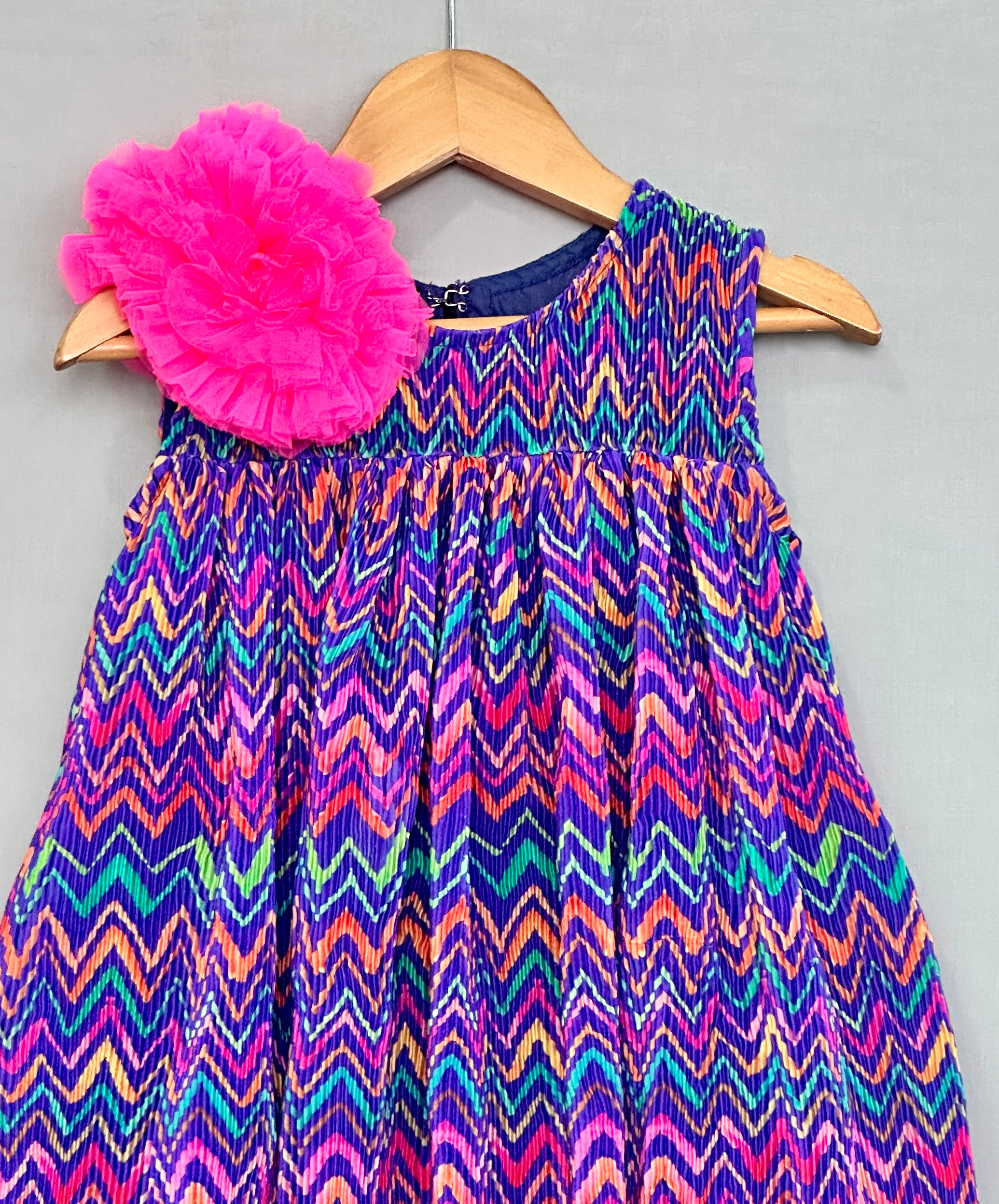Brighten up your little girl's wardrobe with this Vibrant Multicolor Chevron Dress. Designed in a sleeveless silhouette, this playful dress features an all-over zigzag pattern in bold hues of pink, purple, green, and orange. The lightweight pleated crush fabric ensures easy movement, while the oversized hot pink net flower applique on the shoulder adds a fun, eye-catching touch. Perfect for birthdays, playdates, and festive outings!