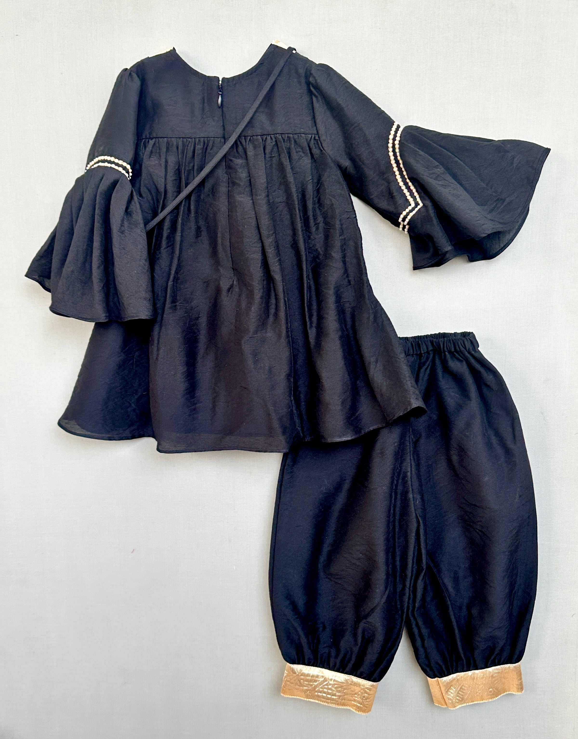 Add a touch of elegance to your little one's wardrobe with this Stylish Black Kurti & Patiala Set. The flared bell-sleeve kurti features a rich gold brocade V-neckline, pearl embroidery on the sleeves, and cute tassels for an ethnic charm. Paired with a comfortable Patiala-style pant with golden cuffs and a matching cutwork embroidered sling bag, this ensemble is perfect for festive occasions, weddings, and cultural events. A perfect blend of tradition and trend! Neck : V-Neck Sleeves : 3/4th Sleeves Closure : Zipper at back Dry Clean only |