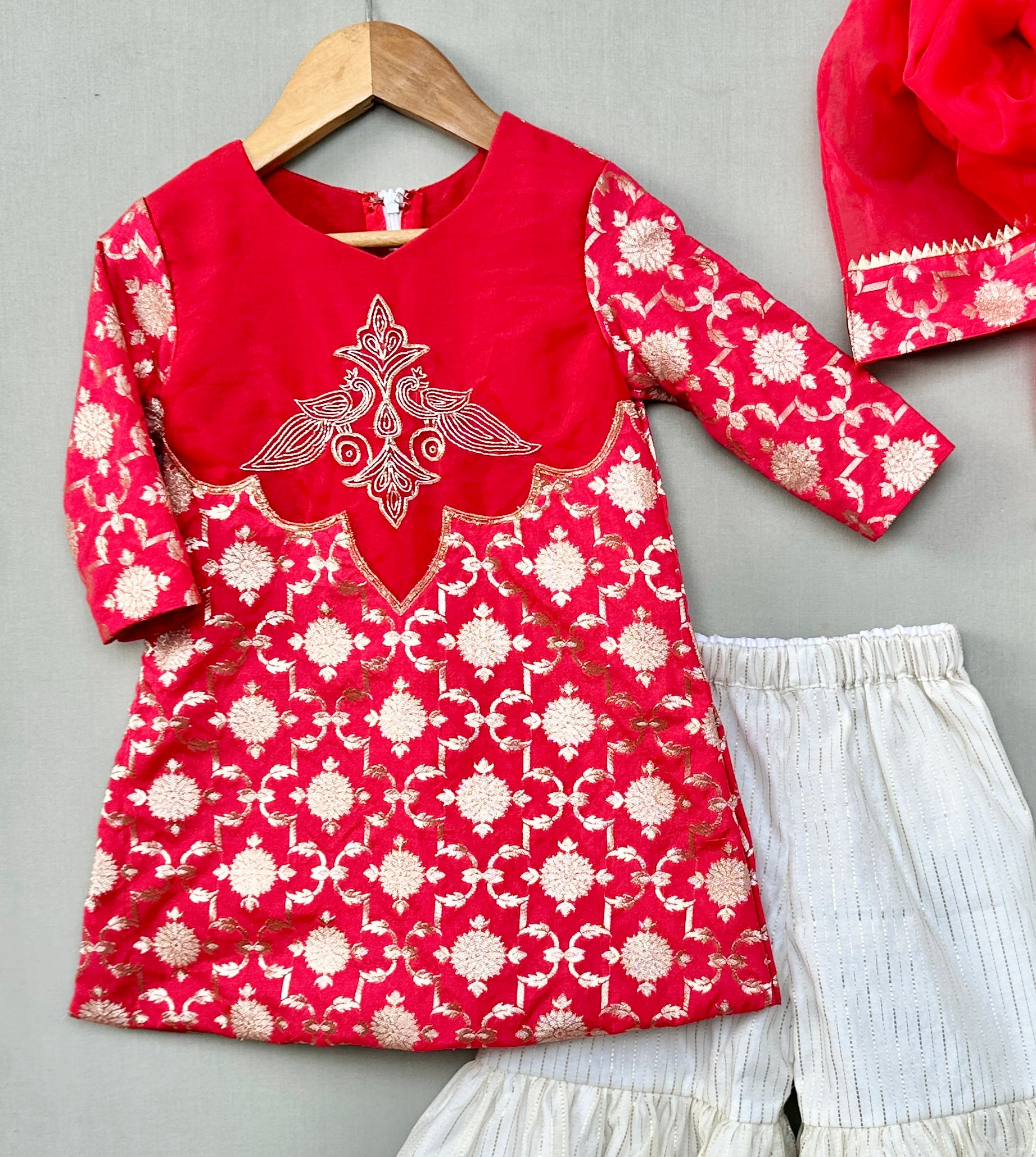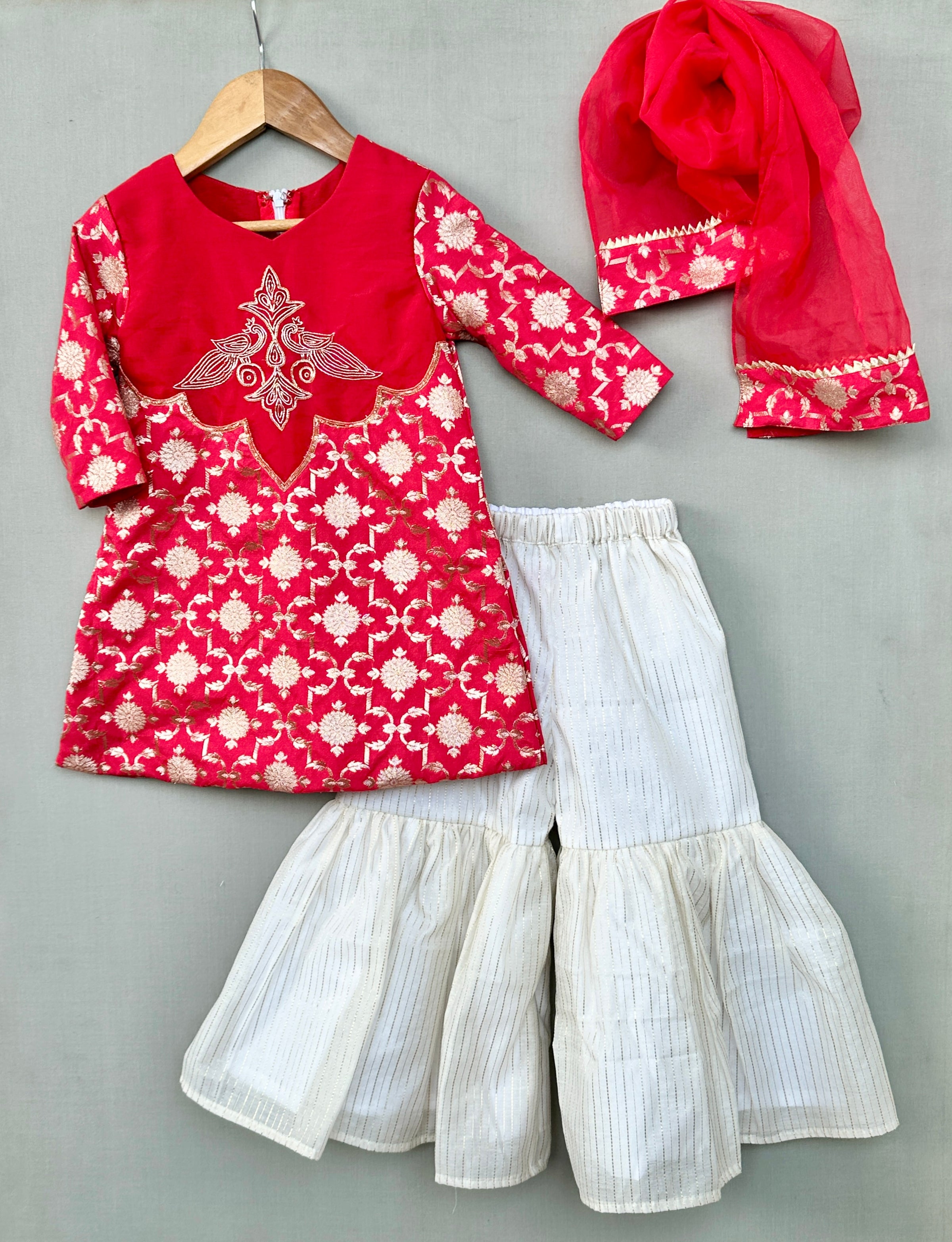 Give your little girl a royal festive look with this Red Kurti and Sharara Set. The rich red kurti is adorned with golden floral brocade work on chanderi and elegant embroidery at the yoke, creating a graceful traditional appeal. It is paired with a flared white sharara crafted in katha embroidered chanderi fabric, adding a modern twist. The set is completed with a matching red dupatta featuring delicate border detailing. Perfect for weddings, festivals, and special occasions! Neck: Round neck Closure: Zipper at the back 3/4th Sleeves Dry Clean Only |