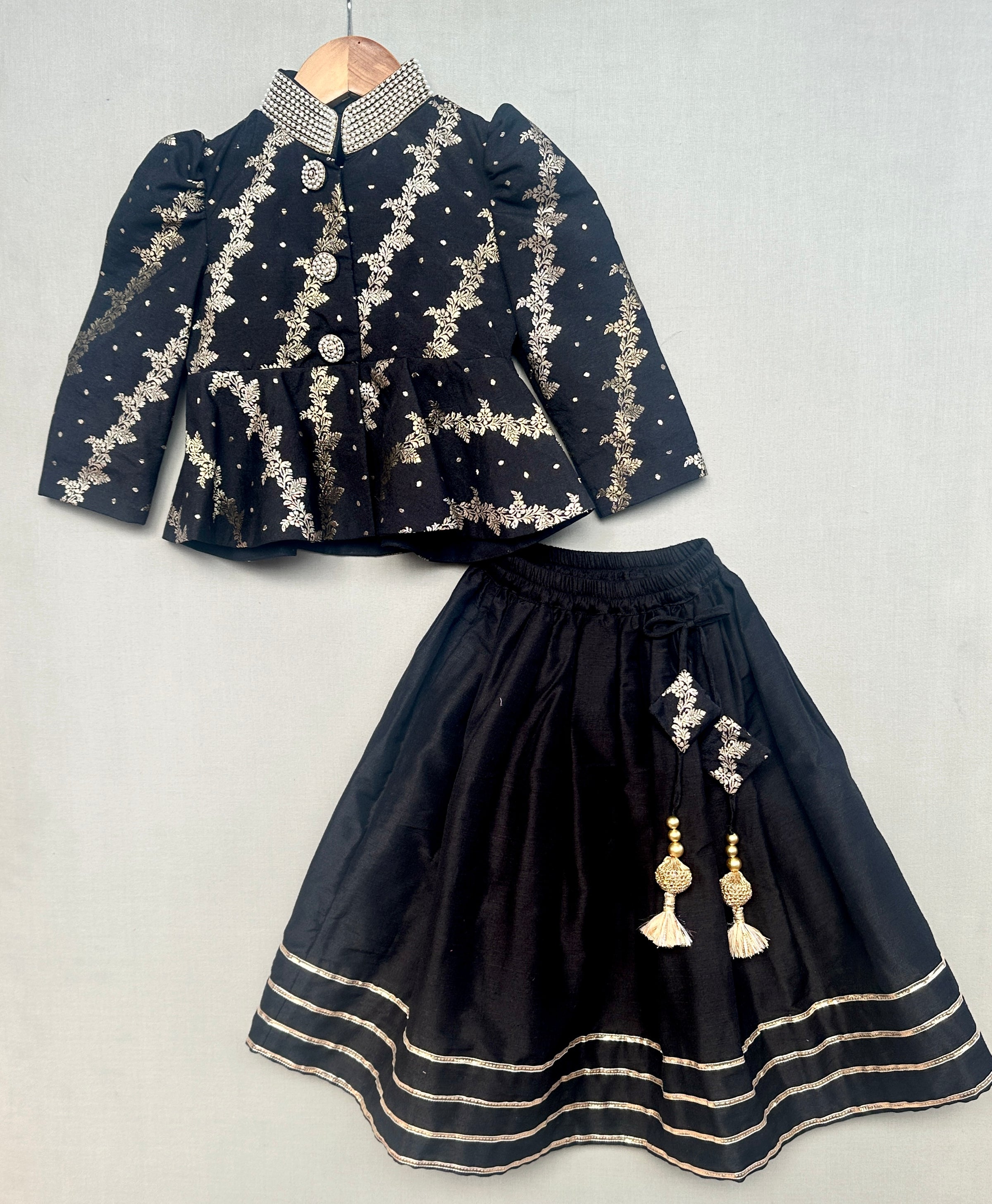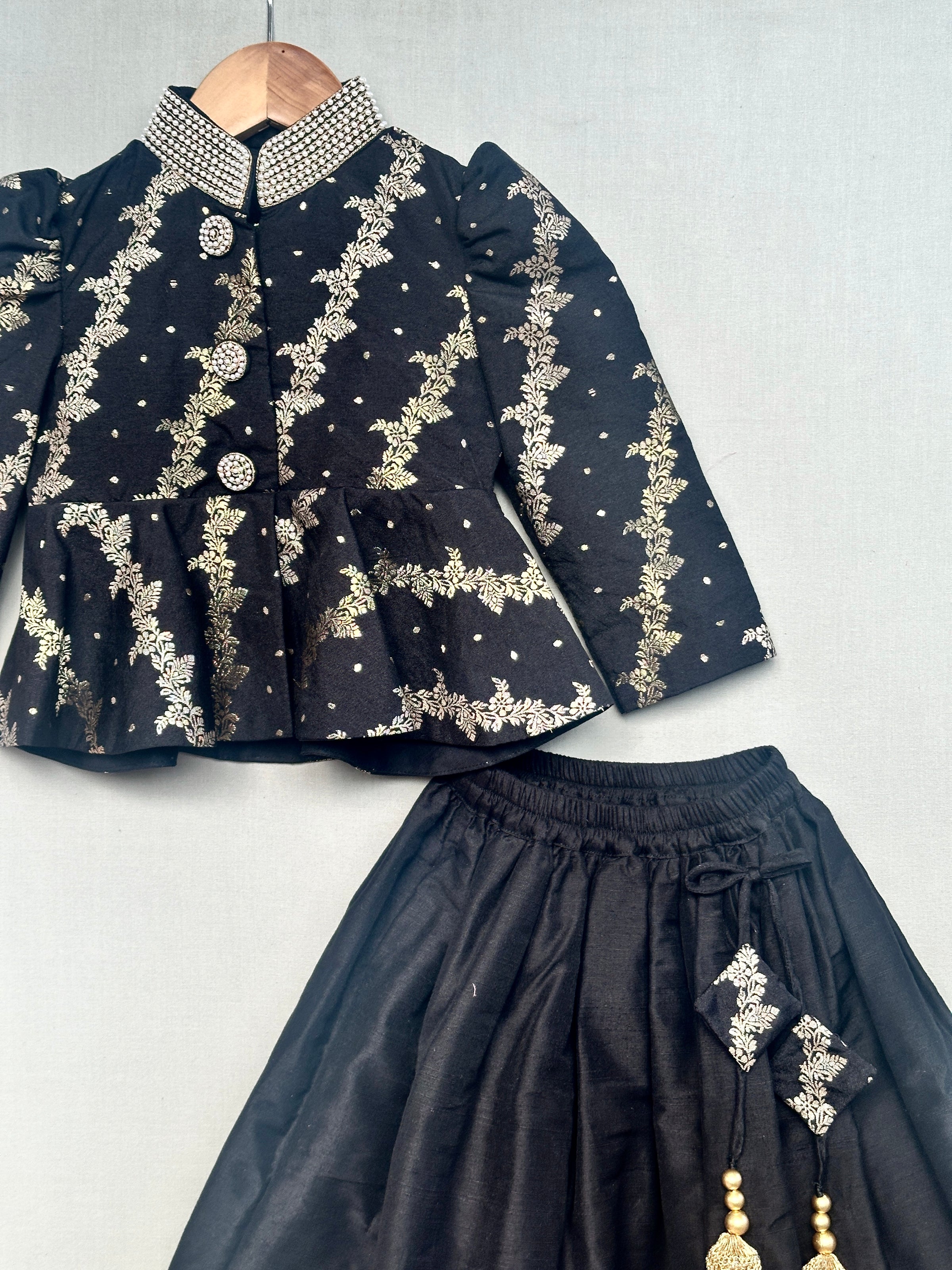 Dress your little diva in this exquisite black lehenga set, designed for elegance and charm. The beautifully tailored jacket features a intricate brocade design on chanderi silk fabric, a dazzling embroidered collar, and matching embroidered buttons, adding a royal touch. Paired with a graceful flared lehenga adorned with delicate tassel detailing and golden border accents, this outfit is perfect for weddings, festive occasions, and special celebrations. Let your princess shine in this timeless ensemble!