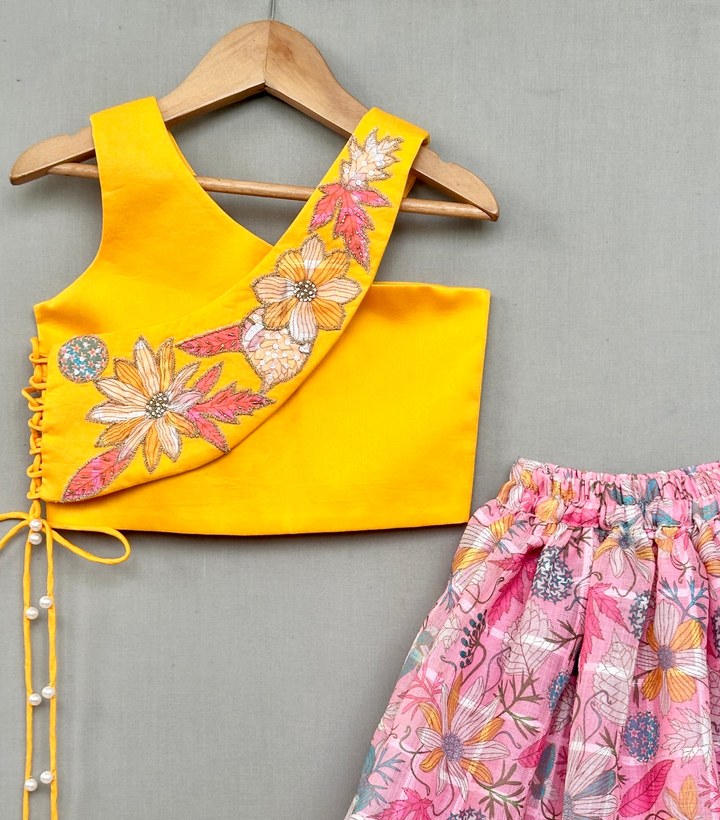 This trendy kids' lehenga set features a stylish yellow blouse with intricate floral embroidery, a unique shoulder strap design, and elegant side tie-up details with pearl embellishments. The flared pink lehenga showcases a delicate floral print with a scalloped lace border and an additional yellow underlayer for a voluminous effect. Perfect for festive occasions, weddings, and special celebrations.