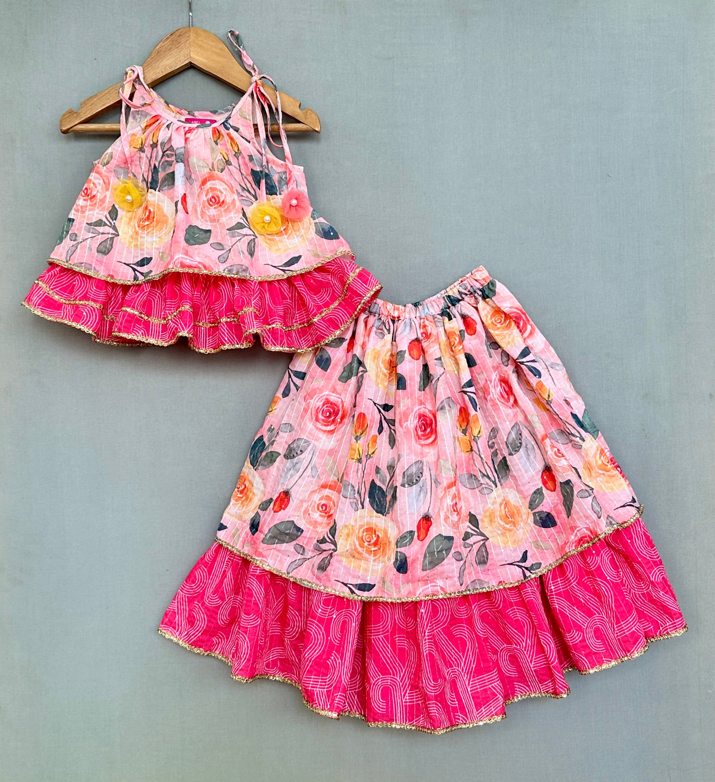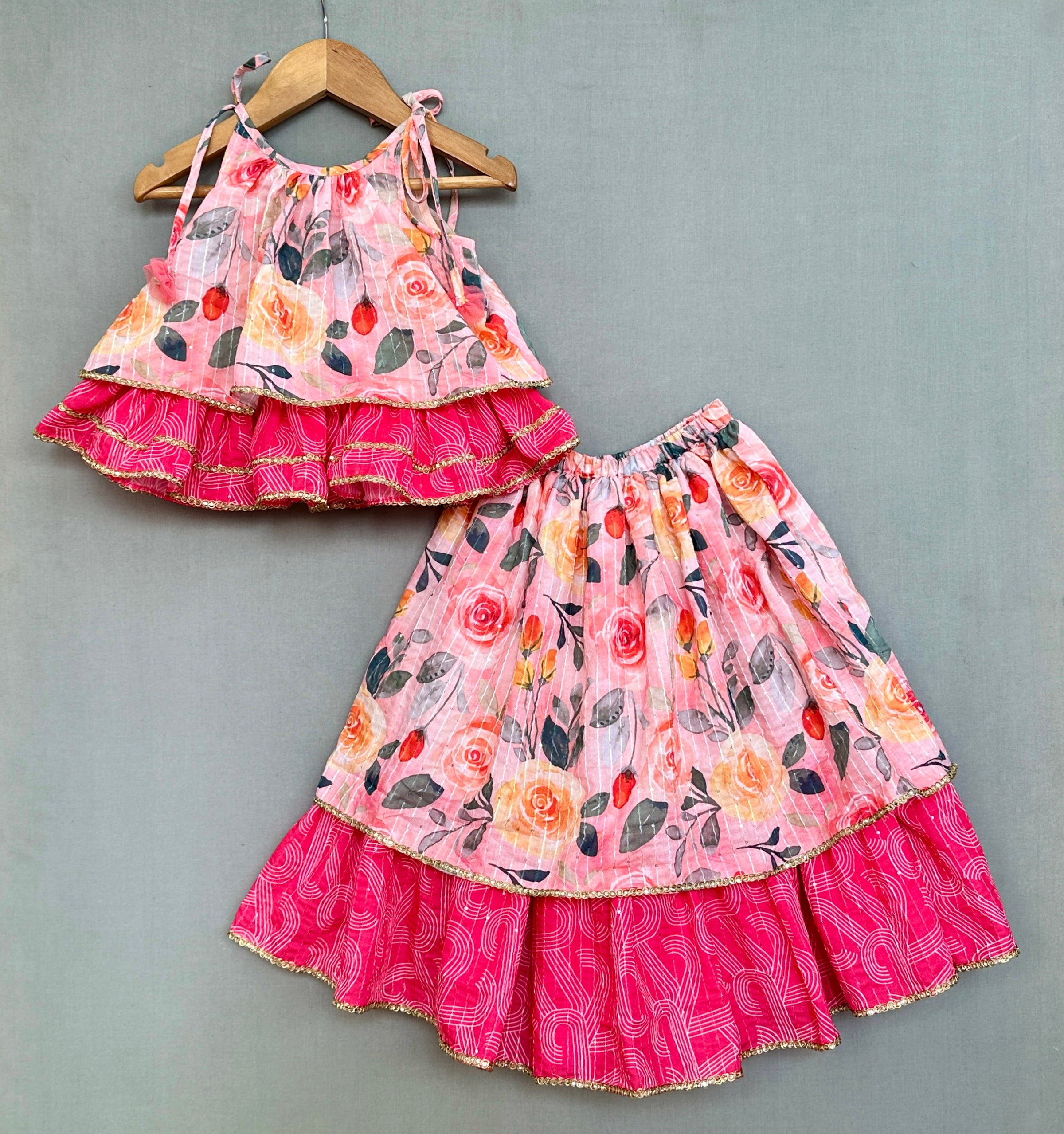 Floral Printed lehenga with elasticated waist and layered geometric printed frilly layer with lace work at hem.