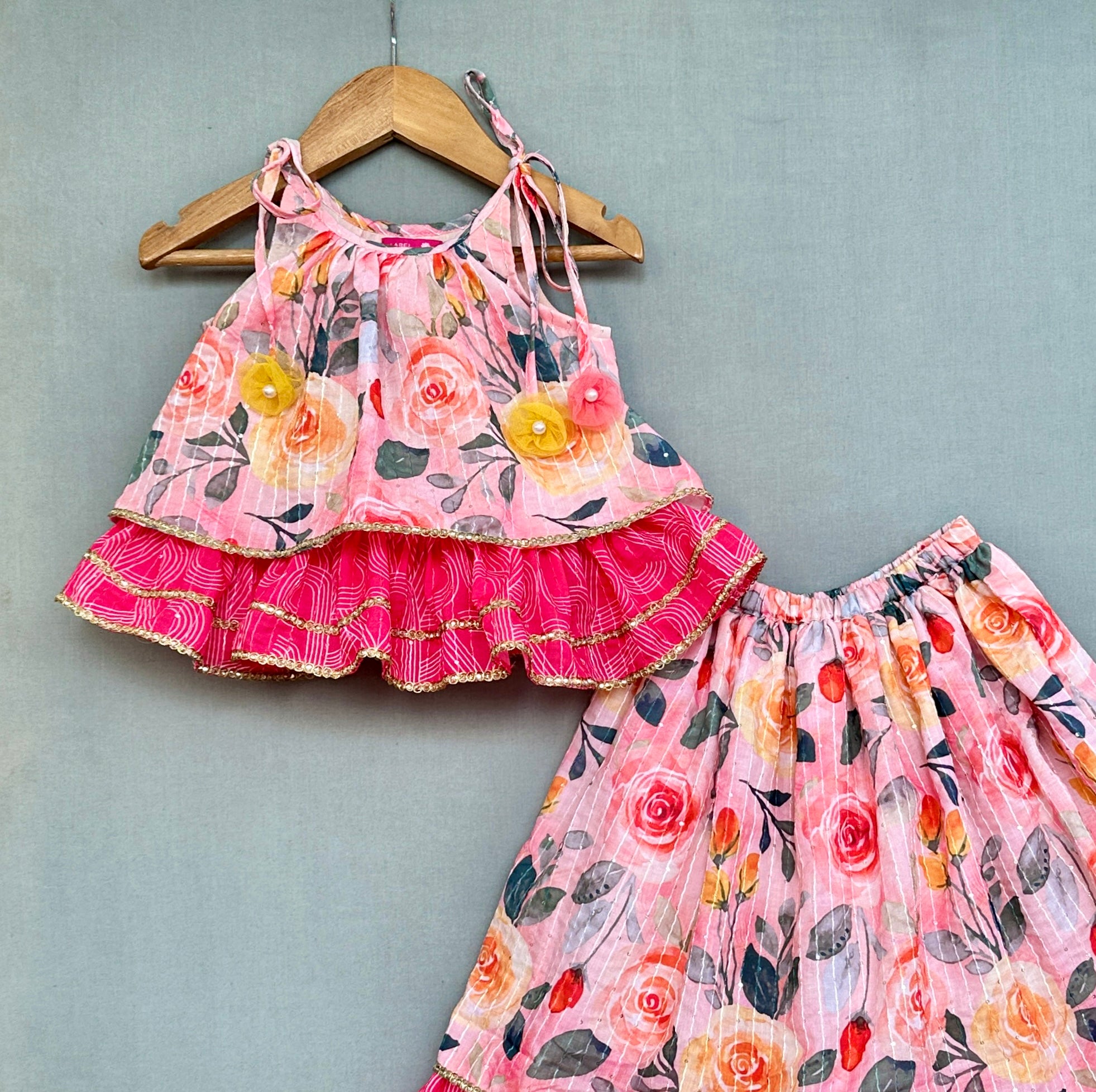 Floral Printed Top with tie-up spaghetti straps on shoulders and elegant net flower tassels attached to it.