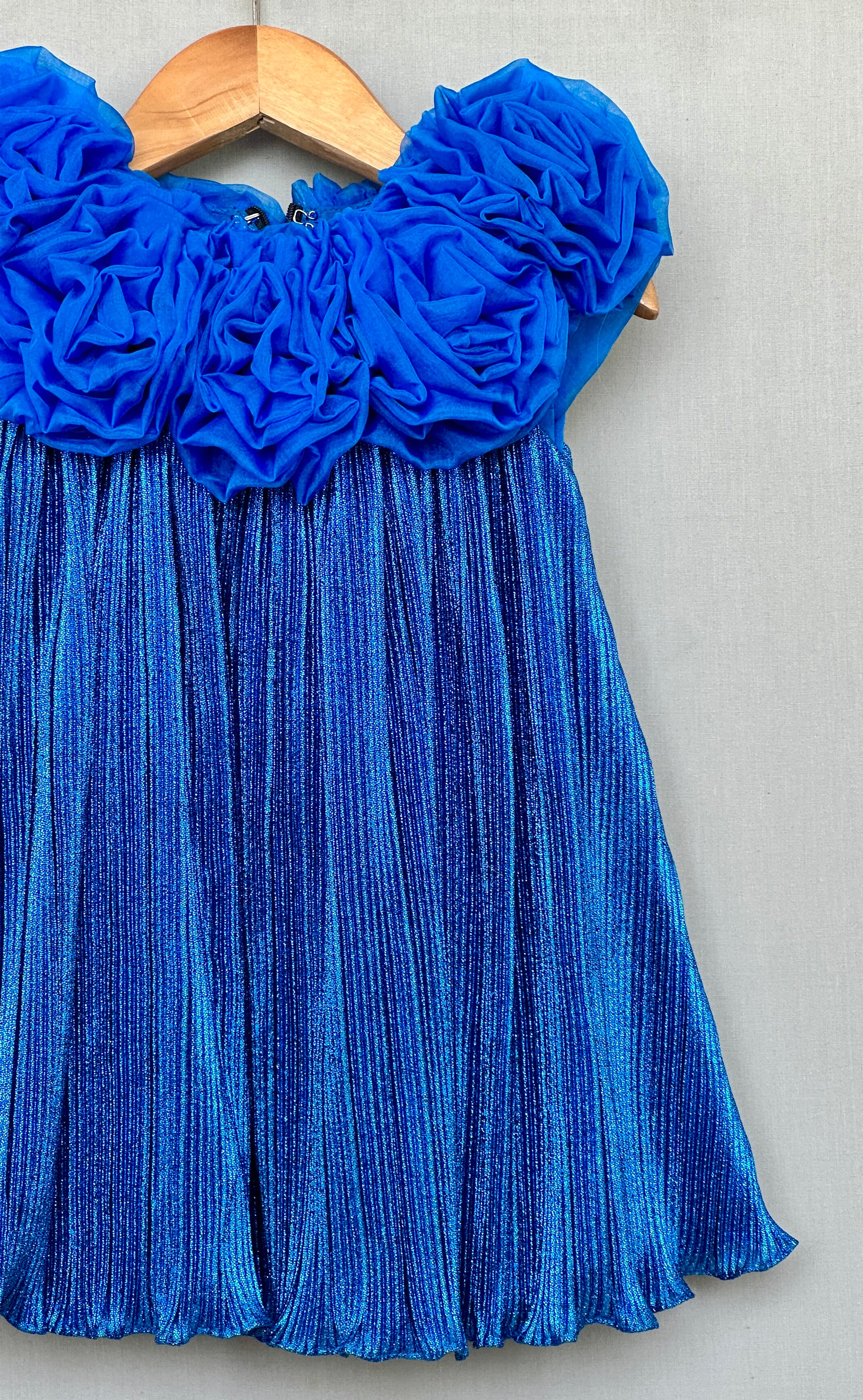 Make a bold style statement with this stunning royal blue party dress for girls. Featuring a beautifully pleated shimmer fabric that flows gracefully, this dress is elevated with a dramatic 3D floral bodice made of soft organza rosettes. Perfect for birthday parties, festive events, or photo shoots, this dress combines elegance and flair in one vibrant package!