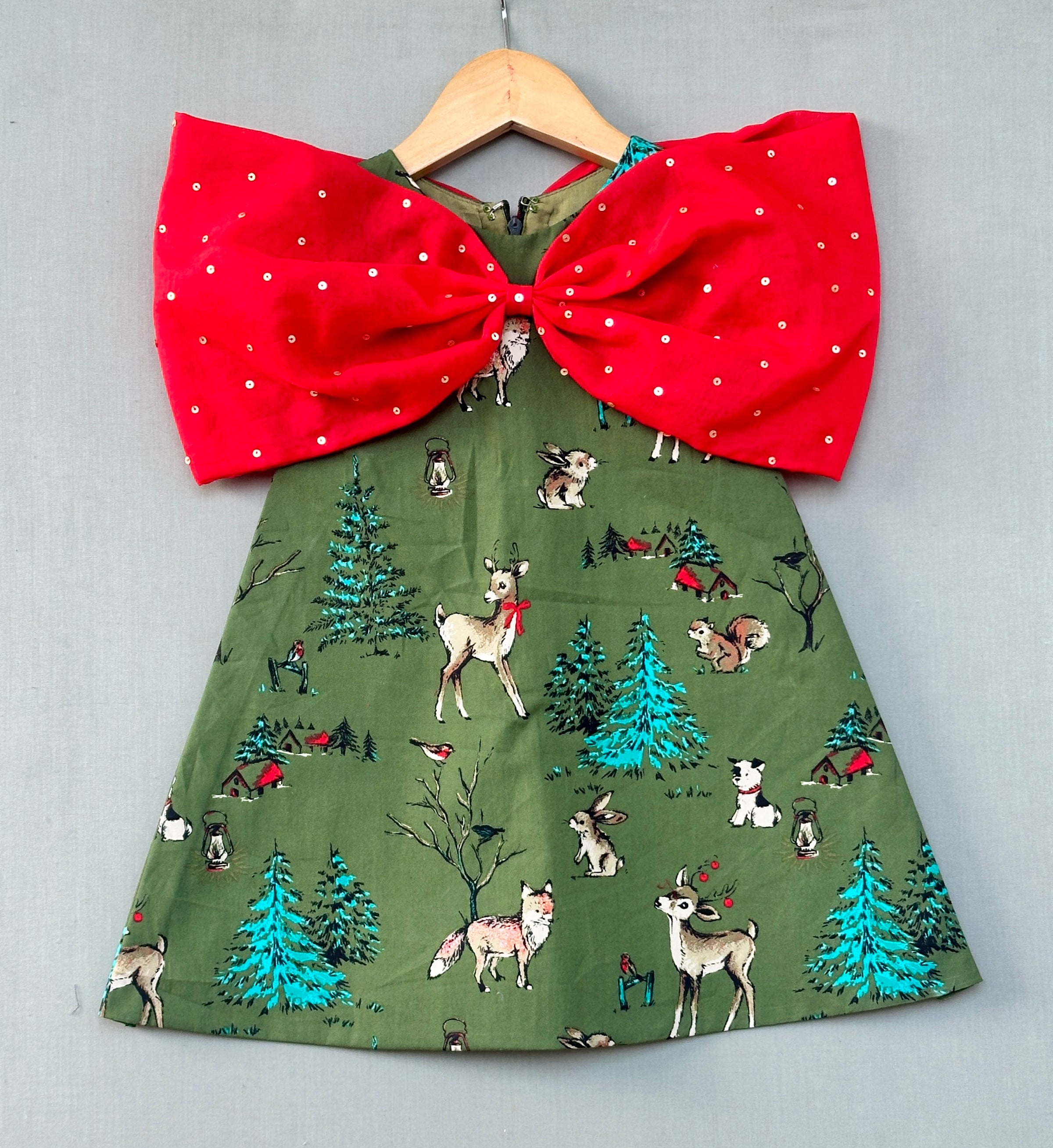 This adorable A-line dress in an elegant olive green shade features a charming woodland print with deer, rabbits, and foxes, making it perfect for little nature lovers. The highlight of this outfit is the oversized red bow adorned with pearl embellishments, adding a festive and playful touch. Ideal for parties and play dates